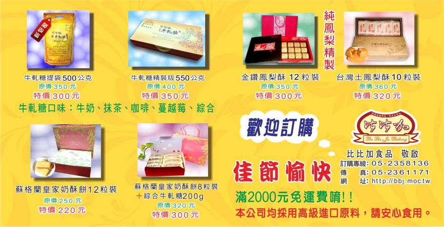 > - 115年最新訊息‧感謝客戶對比比加長期支持,很抱歉因應原料價上漲,本公司精裝版牛軋糖包裝略有調整,更改為550公克,敬請見諒,也懇請各位繼續给我們支持,謝謝。
